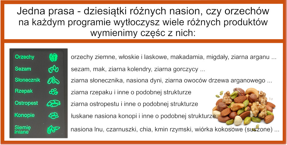 W prasie Yoda Premium MOŻEMY TŁOCZYĆ: nasiona lnu, nasiona słonecznika, orzeszki ziemne, mak, orzechy makadamia, pistacje, migdały, sezam, orzechy włoskie, nasiona arganowe, nasiona gorczycy, nasiona chia, orzechy brazylijskie, nerkowiec, nasiona dyni, pestki winogron, nasiona konopi, nasiona rzepaku, nasiona kolendry, ostropestu, czarnuszki i inne.