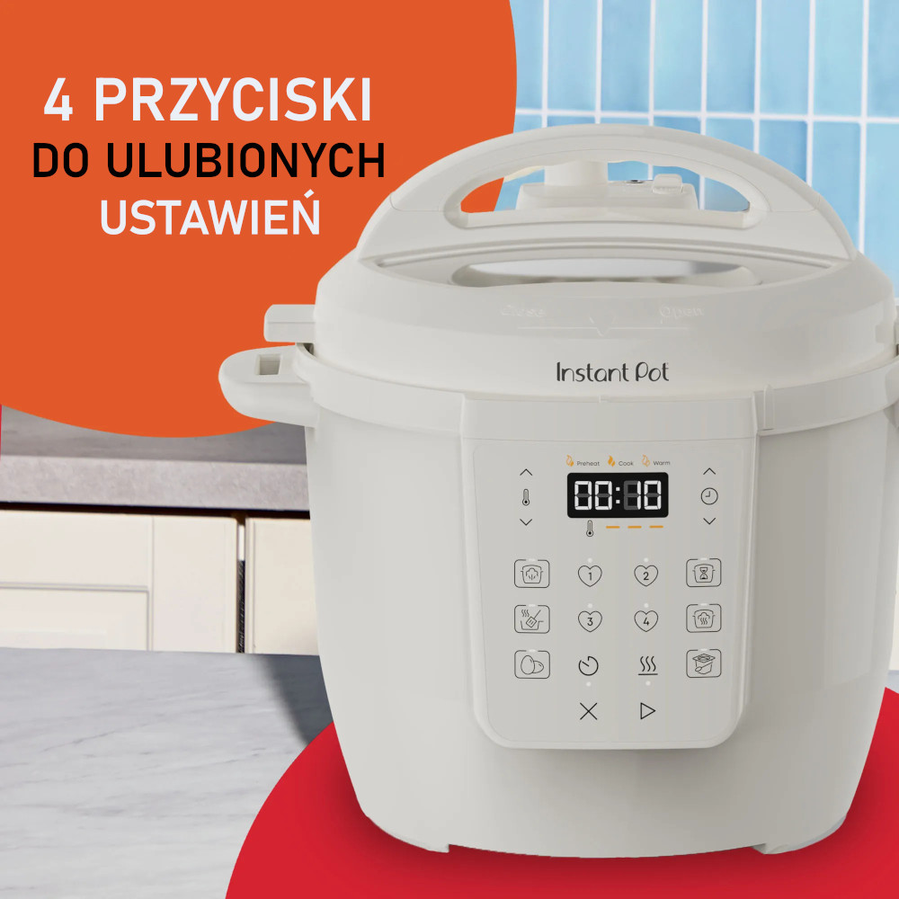 PROSTE I BEZPIECZNE – Zapisz swoje ulubione dania instant za pomocą 4 konfigurowalnych przycisków ustawień wstępnych, aby uzyskać łatwy dostęp do ulubionych ustawień. Ponadto ciesz się gotowaniem bez obaw o wykipienie, dzięki łatwej w uszczelnieniu pokrywie i bezpiecznemu przełącznikowi uwalniania pary.